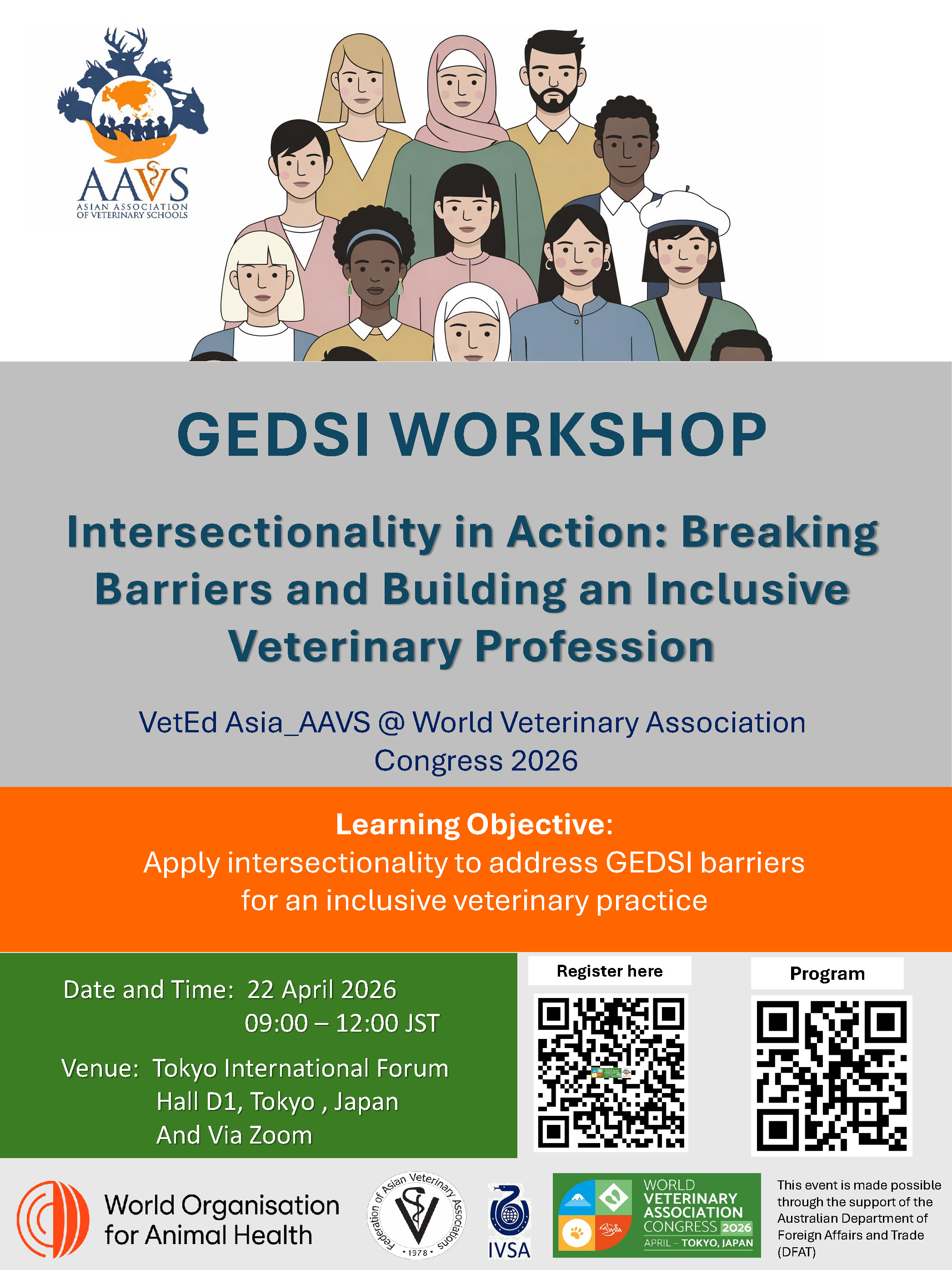 On 22 April 2026, one day prior to our GEDSI session, the Asian Association of Veterinary Schools (AAVS) will host a workshop, “Intersectionality & GEDSI in Veterinary Practice: Who Is at the Table?”, as part of the 24th Annual Meeting of the Asian Association of Veterinary Schools (AAVS) (“VetEd Asia 2026”). See the flyer and their website event page for more details.