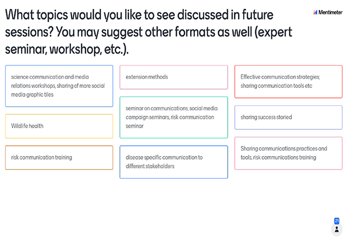 Finally, the meeting included a Mentimeter-led discussion on how to engage the network, concluding that brief sessions through the year were most optimal, with information shared via email or possibly newsletters. Topics suggested for future sessions included safe and sustainable trade, risk and crisis communication, wildlife health, and more case studies on communication campaign successes and challenges.